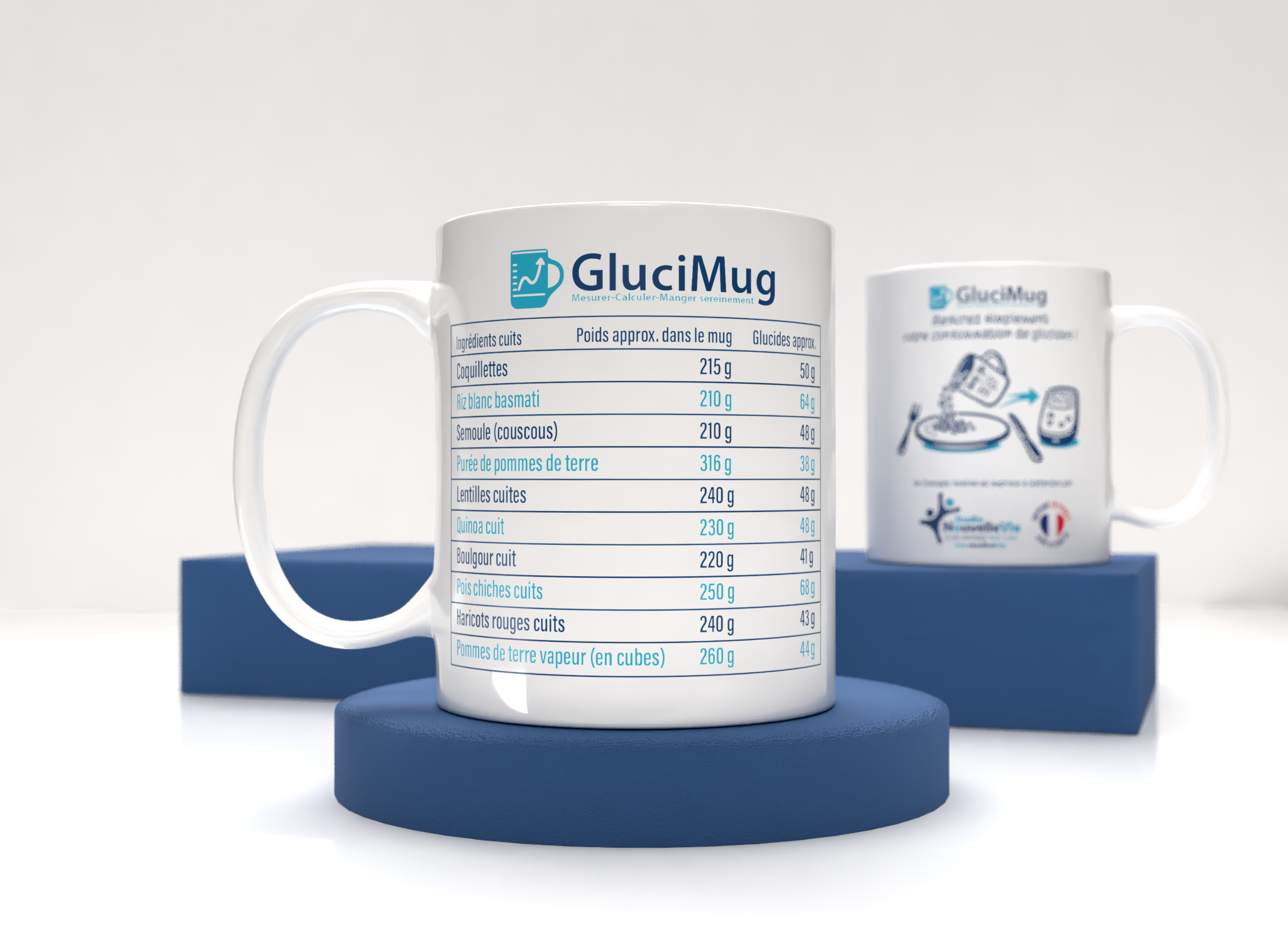 GLUCIMUG est un mug doseur spécialement conçu pour faciliter l’estimation des glucides dans les aliments cuits. Grâce à son tableau de correspondance imprimé directement sur le mug, vous pouvez connaître rapidement la quantité de glucides contenue dans votre portion.