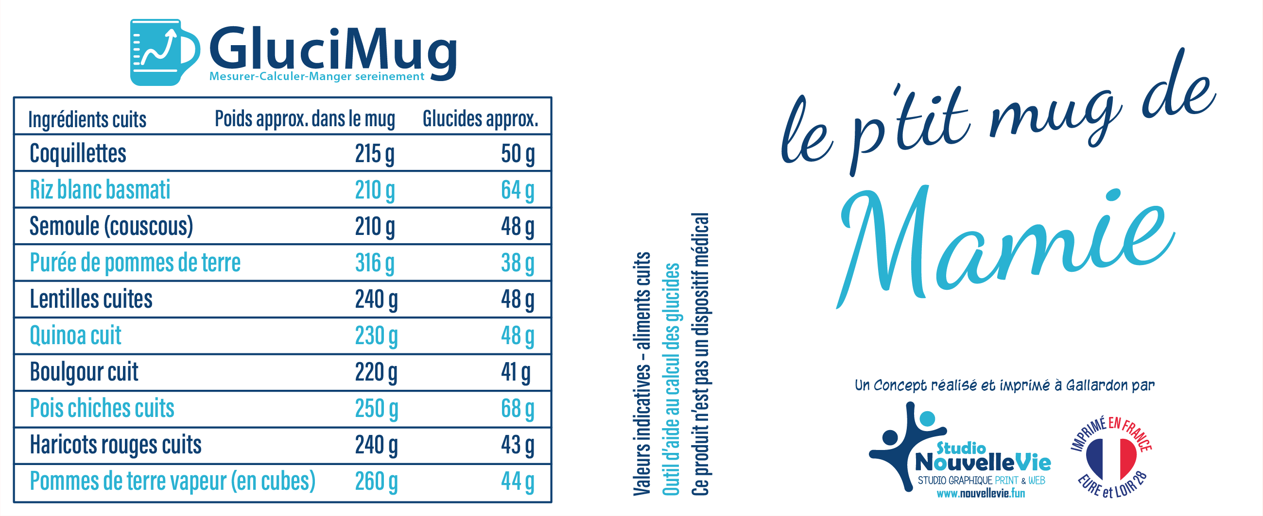 Le tableau imprimé sur le mug indique directement la quantité de glucides correspondant au volume.